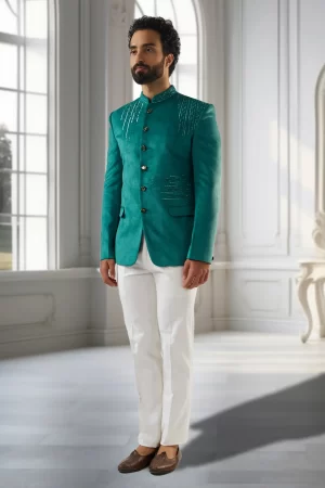 “Cream Mulberry Silk Gold Leather Applique Embroidered Sherwani Set” has been added to your cart.
